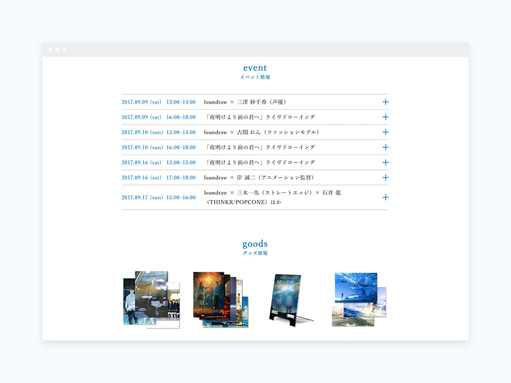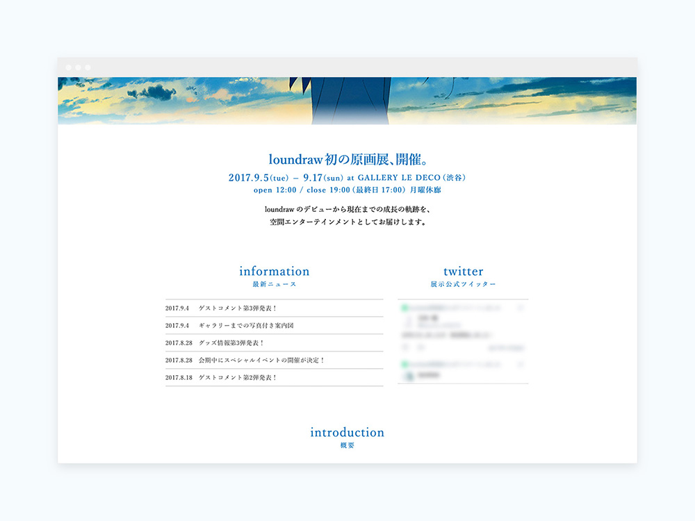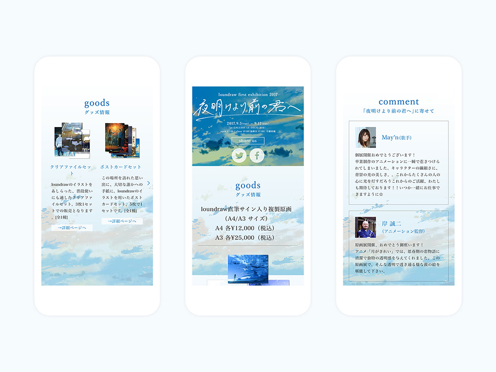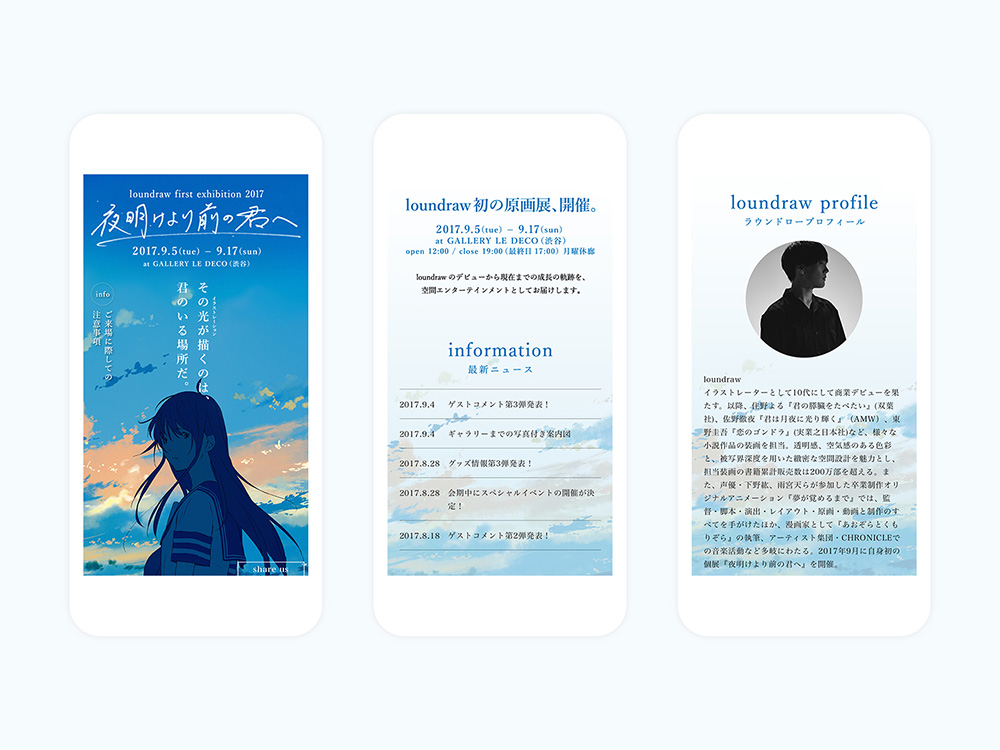 loundraw初の原画展「夜明けより前の君へ」特設サイトの実装と期間終了までの更新を担当いたしました。
