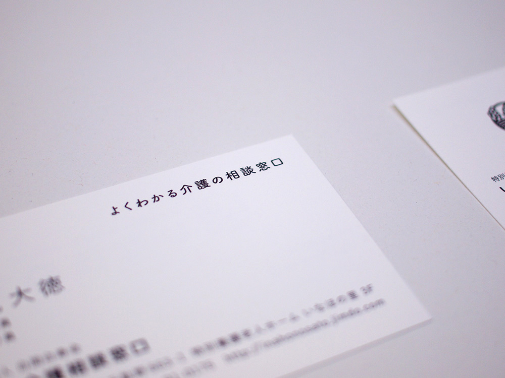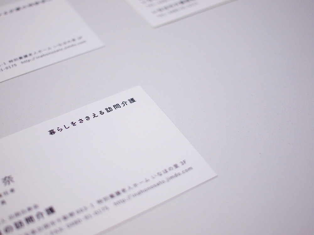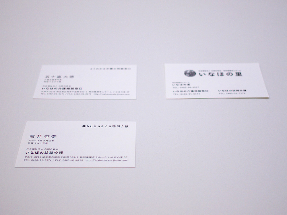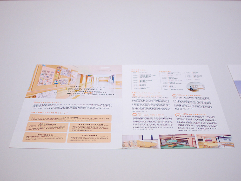 統一されていなかった施設名のロゴの開発、コピー開発、写真撮影に始まり、名刺、施設パンフレットや求人パンフレットなど、そしてサービス名称の開発に至るまで理事長と直接議論しながら制作を続けています。